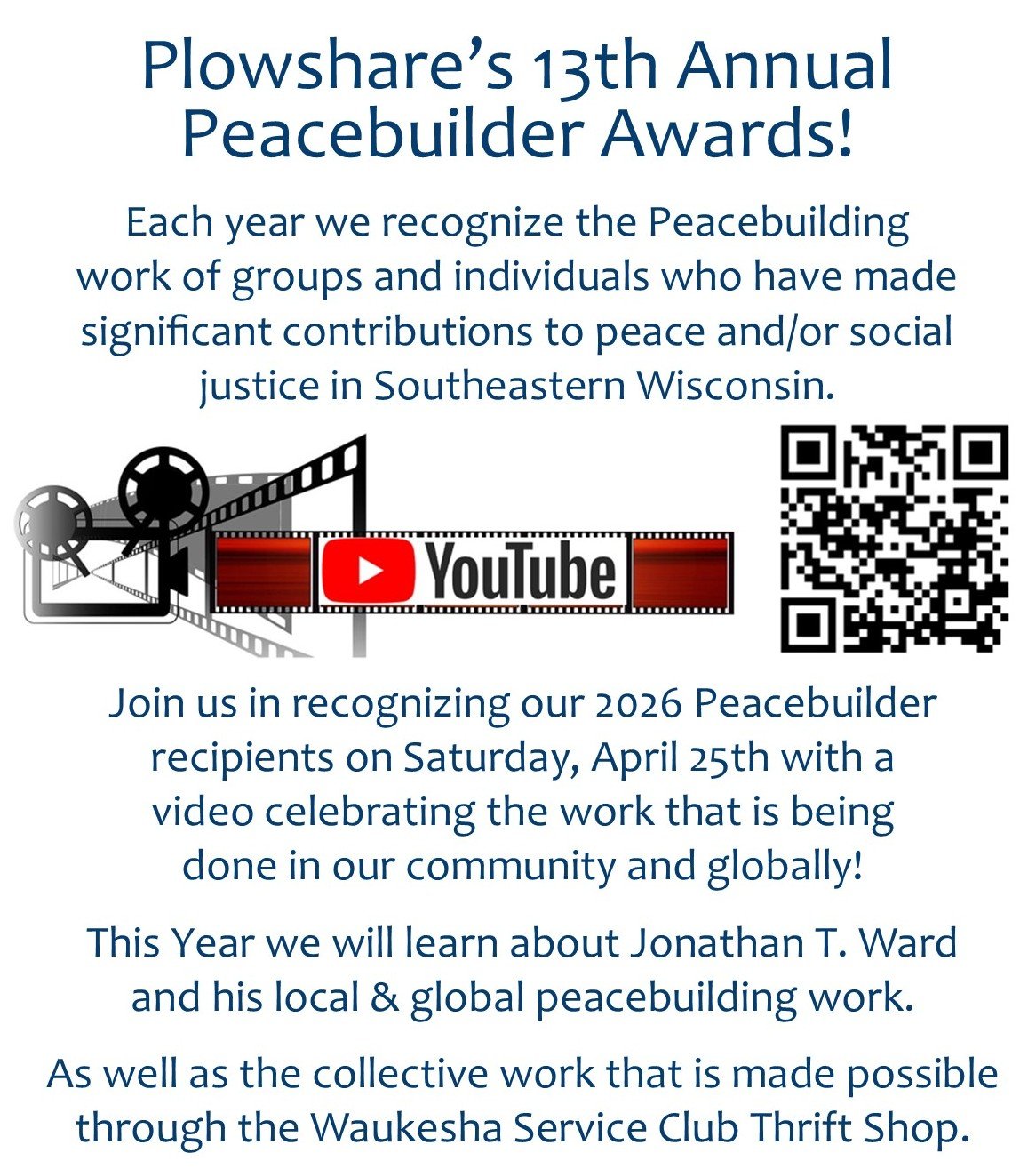 Plowshare Fair Trade Marketplace and Education for Peace in Downtown Waukesha, will present the Waukesha Service Club and Rotarian Jonathan T. Ward with the 2026 Peacebuilder Awards in the Spring fundraising video that will premiere on April 25.